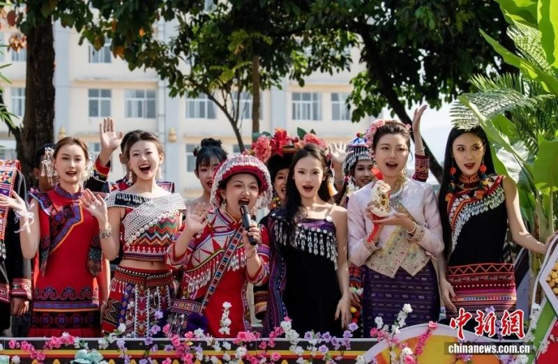 2026年2月19日,地处中缅边境的云南省普洱市澜沧拉祜族自治县迎来拜年习俗活动,该县各乡镇各民族代表组成的拜年团,身着盛装,载歌载舞进行巡游拜年活动。图为身着盛装的拜年团成员向游客问好送祝福。张子晗 摄